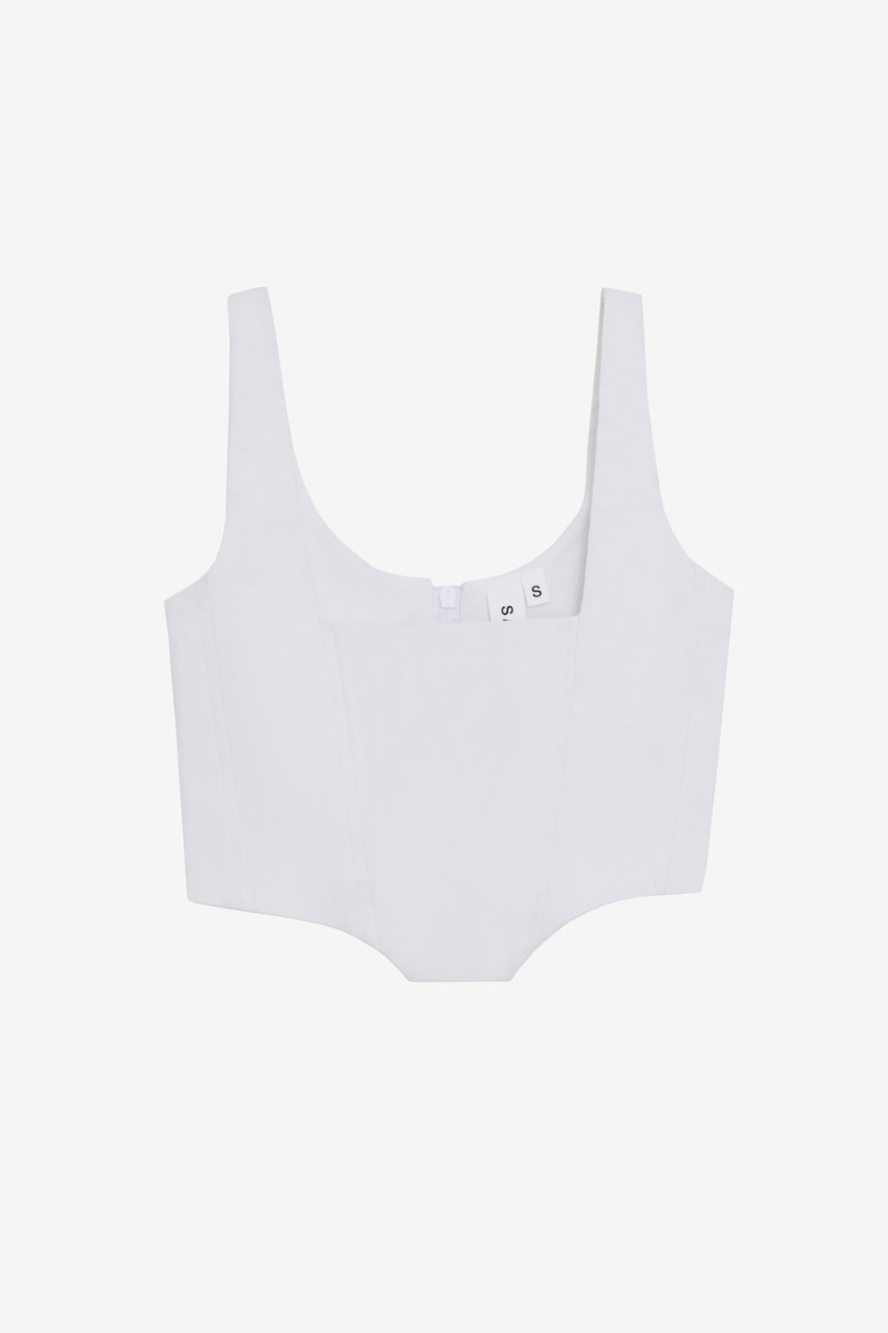 Descripción: Top estilo corset, corto, ajustado con escote cuadrado, ajuste de cremallera trasera y detalle de costuras dobles. Composición: 69% Rayón. 26% Poliamida. 5% Spandex. La modelo está usando talla S. Medidas Talla M: Contorno Busto: 35 cm. Largo Total: 40 cm.